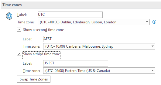 It seems these days that meetings are much more likely to involve multiple time zones. If you are searching Outlook for an available slot in which to hold a meeting it can be extremely handy to have more than one time zone in your calendar. That way you can check that what works for you, isn't the middle of the night for the other attendees.